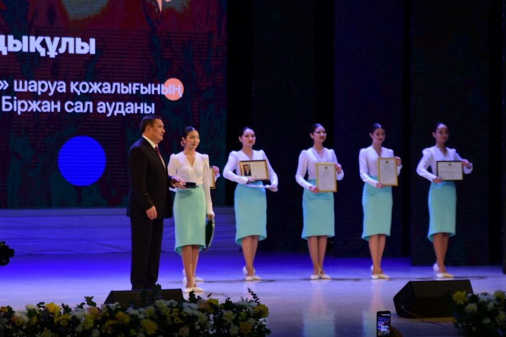 На торжественном собрании ряд наших земляков был награждён орденами «Құрмет», «Еңбек даңқы», медалью «За трудовое отличие», Благодарственным письмом Премьер-Министра Республики Казахстан, нагрудным знаком «Лучший работник сельского хозяйства» и другими государственными наградами. Церемонию награждения провели участники народного ансамбля танца «Он алты қыз».